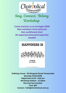 Welcome to 2026. Our workshop to start the year of singing is coming up at the end of the month on Saturday morning 31st of January. Confirm your attendance with a BSB payment (details under FEES tab) – label with your name & 2026 workshop. See you there!!